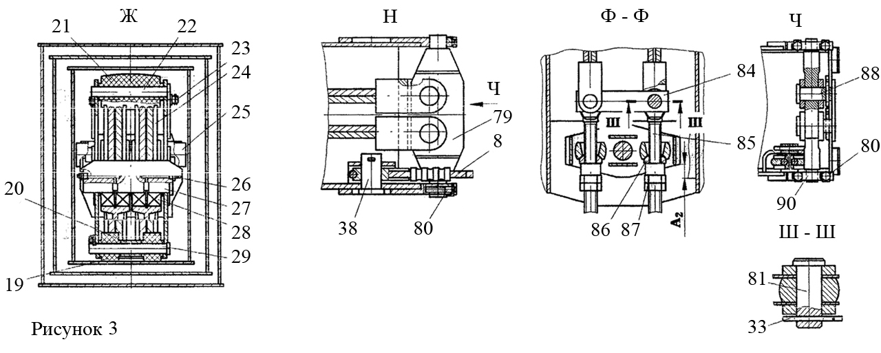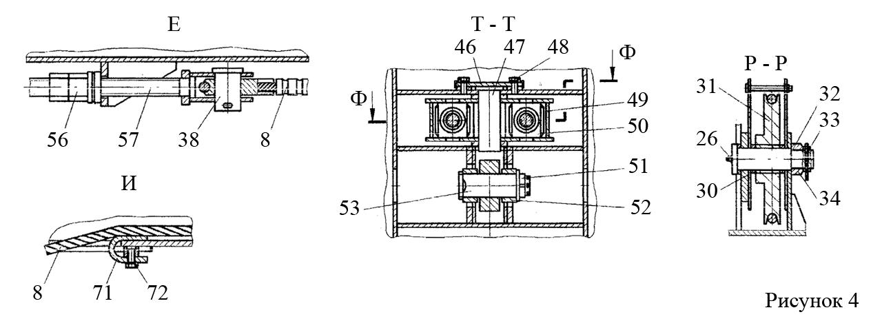 - установить на кронштейн 5 ролики 19 и 21, которые закрепить соответственно осями 22 и 29. Между роликами 19 установить проставную втулку 20. Оси зафиксировать оседержателями, которые закрепить болтами с отгибными шайбами (рис. 3, вид Ж);