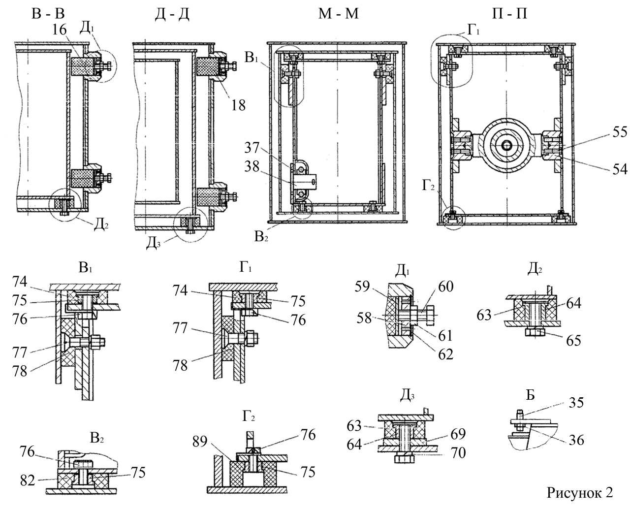 - установить в отверстия секции 2 упоры 16 (4 шт.), шайбы 58 и закрепить кольцами 62. Навернуть на болты 60 по гайке 61. Ввернуть болты с гайками в шайбы 58 (рис. 2);