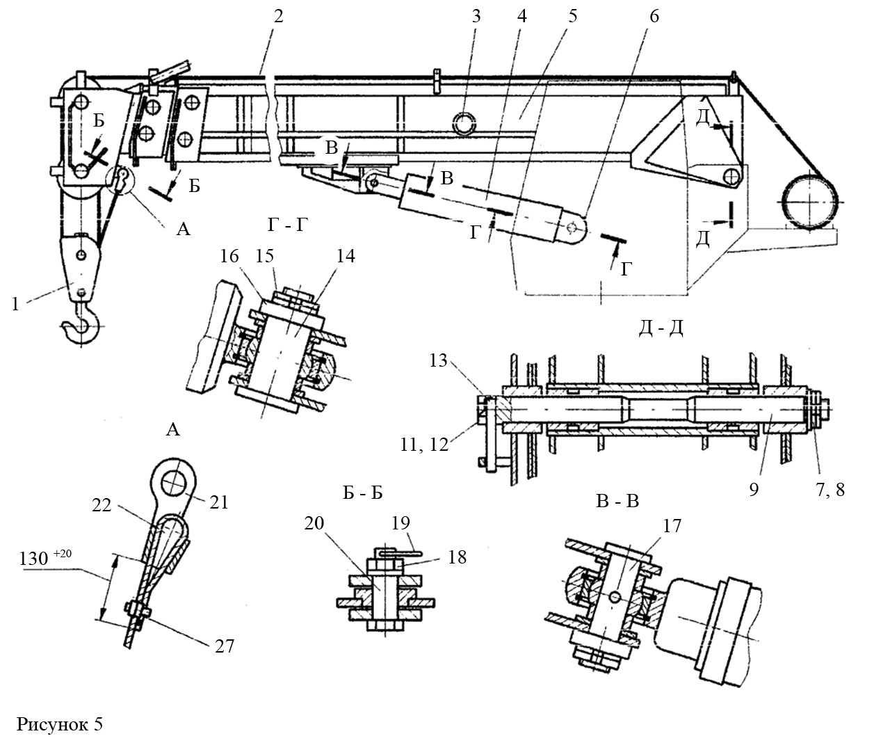 - застропить стрелу в сборе, поднять и переместить, обеспечив совмещение отверстий в основании стрелы и в поворотной платформе под ось 9 (рис. 5);